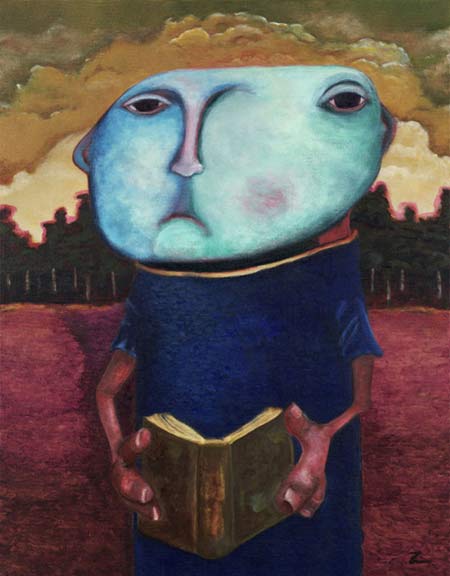 "Reading upside-down love stories (self portrait)" acrylic on canvas 20" x 28" October - 2002