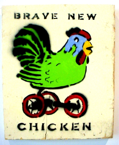 Brave New Chicken , 2003 Spray Paint and Acrylic, 6" x 8", on found object